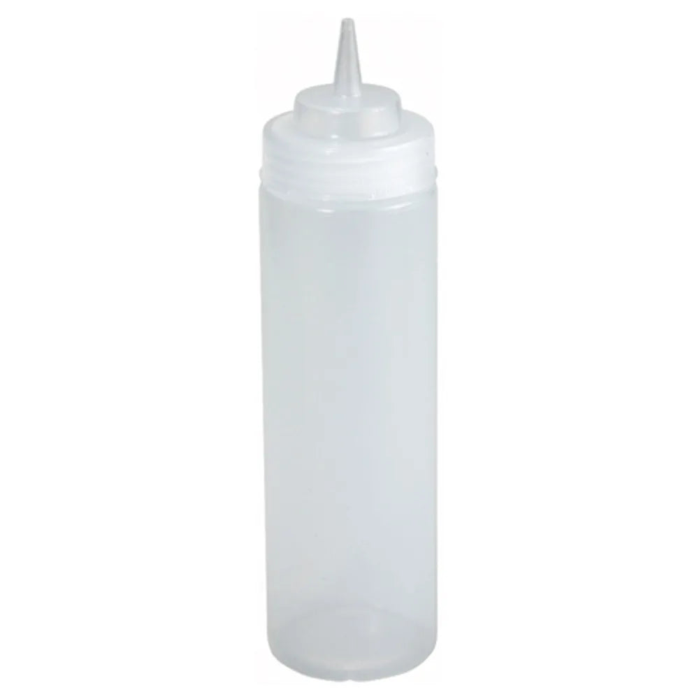 The Winco PSW-24 plastic squeeze bottle can be used for ketchup, mustard, mayonnaise, and other condiments. Because it is made of transparent plastic, customers can see what's inside and operators can see how much is left. For refilling, it has a wide mouth, and its tip comes pre-cut and ready to use.